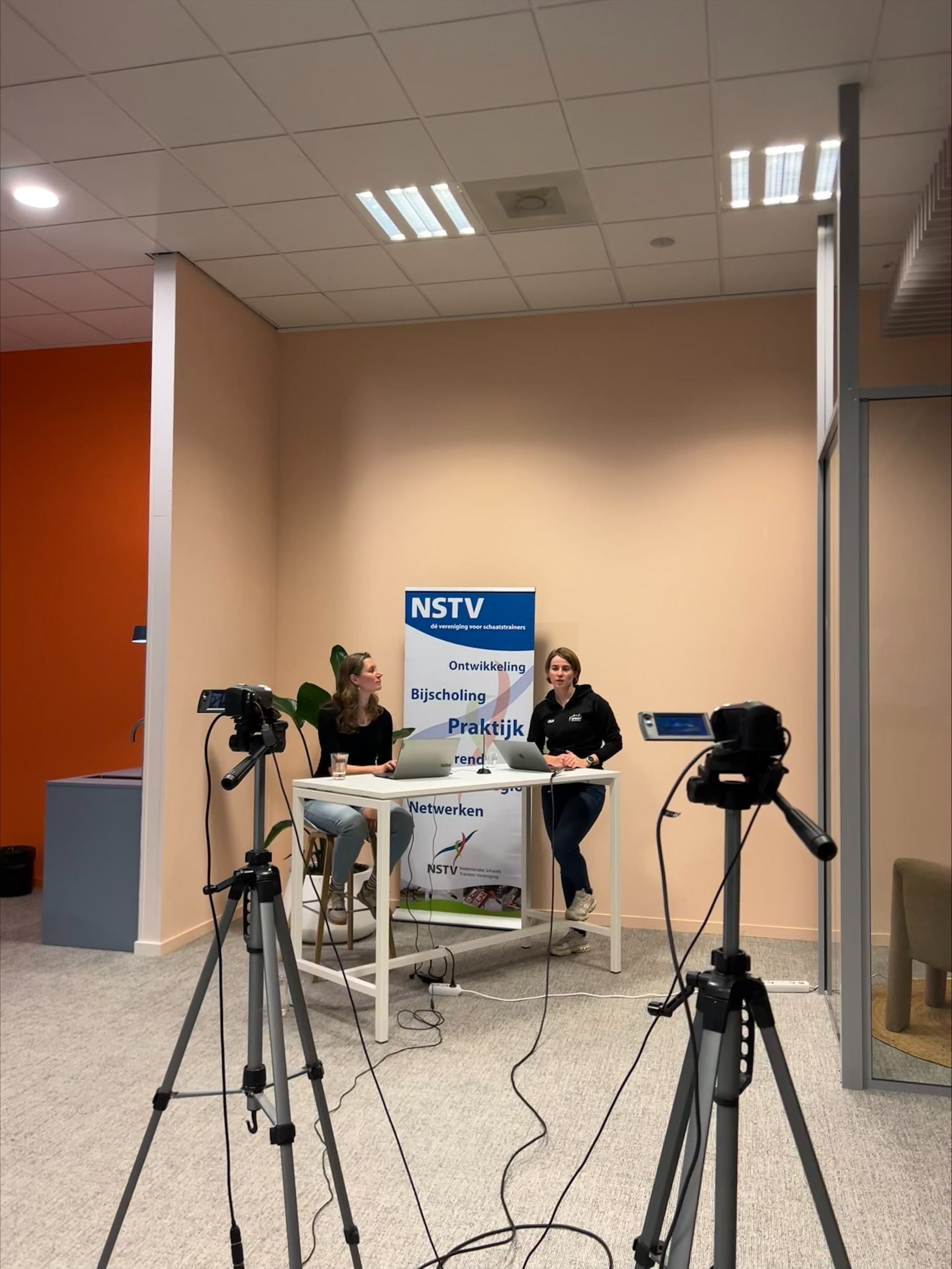 Vervolgens gingen we verder concretiseren welke aanzichten er mogelijk zijn om te filmen: zij-aanzicht, vooraanzicht en achteraanzicht. En natuurlijk ook statisch of dynamisch door achter iemand te schaatsen. Manon lichtte toe hoe zij de verschillende aanzichten inzet om in te zoomen op verschillende technische aspecten. Wanneer kies je voor welk beeld? Dit werd uitgebreid en op een interactieve manier besproken. Dit gaf de aanwezigen vele concrete handvatten om mee aan de slag te gaan op een systematische manier.